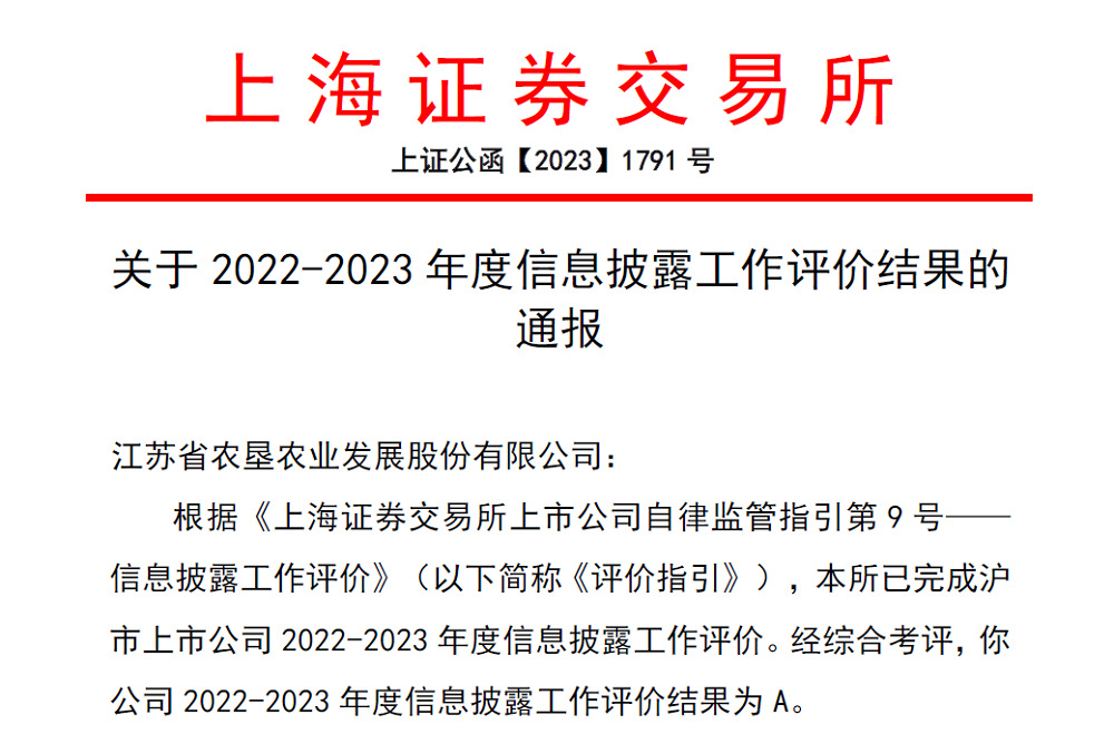 近日,上海证券交易所公布沪市主板上市公司2022-2023年度信息披露工作评价结果,苏垦农发(股票代码:601952)再次荣获信息披露工作“A”级评价(最高级),这也是公司连续第四年获此殊荣,充分体现了证券监管机构对公司法人治理、信息披露和投资者关系维护等方面工作的高度肯定。 信息披露质量是上市公司质量的重要体现,也是投资者投资决策的主要依据。2023年8月,上交所对《上海证券交易所上市公司自律监管指引第9号——信息披露工作评价》(以下简称《评价指引》)进行修订,对上市公司信息披露工作提出了更加严格的标准和更高的要求,同时对最近一年信息披露工作评价结果为A的上市公司,给予更多的支持和便利。本次评价是新《评价指引》实施以来的首次信息披露评价。苏垦农发凭借高质量的信息披露、规范的公司治理等多方面的综合表现,再次荣获上交所信息披露工作A级评价,对公司进一步树立良好的资本市场品牌形象,对未来的资本运作、市值管理等工作均将起到积极的推动作用。 评价期内,苏垦农发不断强化合规意识和风险意识,紧密关注上交所监管动态,持续提升信息披露工作质效,一是不断提高透明度,在定期报告中首次增加图表