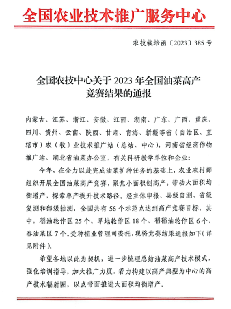 近日,农业农村部全国农业技术推广服务中心公布了2023年全国油菜高产竞赛结果,苏垦农发弶港分公司百亩攻关方以亩产367.64公斤刷新全国稻油轮作油菜高产记录,较原纪录提高43.77公斤,荣获本次全国油菜高产竞赛全组别第一名。2023年全国油菜高产竞赛活动由农业农村部全国农业技术推广服务中心主办,旨在“聚焦小面积创高产、带动大面积均衡增产,探索单产提升技术路径”。本次竞赛,全国共有56个示范点达到高产竞赛目标,其中,稻油轮作区25个、稻稻油轮作区6个、旱地轮作区18个、春油菜区7个。近年来,苏垦农发认真履行粮食安全“国家队”使命职责,依托国家油菜扩种项目,深入推进油料产能提升工程,不断优化油菜种植策略,完善配套农机装备,狠抓大面积平衡增产,收获良好的经济和社会效益。本次高产竞赛成绩的取得,为全国油菜高产技术示范推广树立了典范,并提供了可复制可推广的“苏垦经验”。下一步,苏垦农发将以此为契机,扛稳保障粮食安全责任,落实“藏粮于地、藏粮于技”国家战略,深化“藏粮于管”特色举措,围绕高效、高质、高产、控本的“三高一控”现代农业生产目标,推动生产方式由“增产”向“增效”转变,为全省农业现代化高质