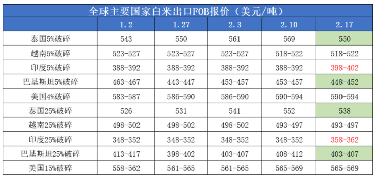 本周印度最大的大米处理地区又开放一处港口,有望缓解拥堵情况,因此大米出口价格有所回落,破碎率5%蒸谷米价格跌至395-401美元,低于一周前的402到408美元。