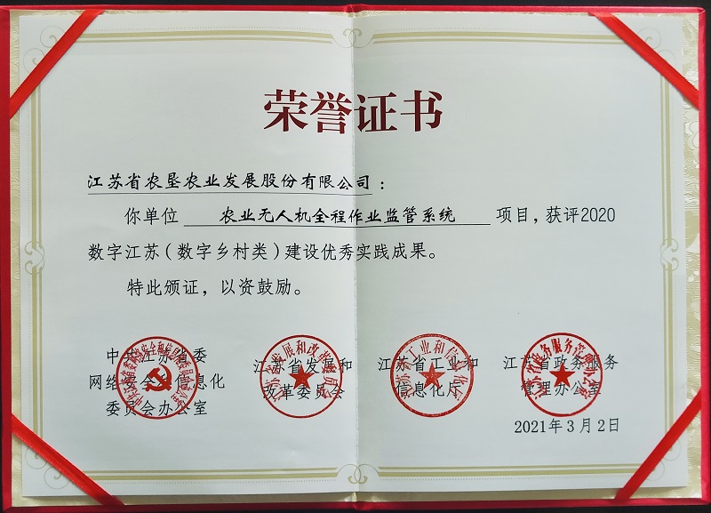 数字江苏建设优秀实践成果评选由省委网信办、省发展改革委、省工信厅等四部门联合组织,旨在贯彻落实习近平总书记关于网络强国的重要思想,进一步总结宣传推广我省信息化发展的成功经验和生动实践,加快推进数字江苏建设。本次评选工作共征集459个成果项目,最终确定60个项目入选年度“数字江苏建设优秀实践成果”。在集团企划部指导下,苏垦农发精心组织成果总结和报奖工作,农业无人机作业质量监管系统建设项目获评2020年数字江苏建设(数字乡村类)优秀实践成果,体现了公司智慧农业建设水平,展示了江苏农垦形象。