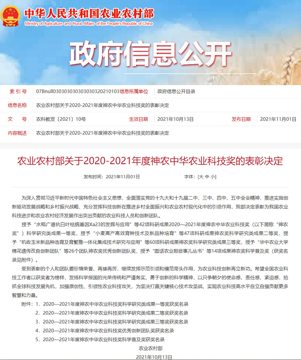 11月1日,农业农村部官网发布了《关于2020-2021年度神农中华农业科技奖的表彰决定》(农科教发〔2021〕10号),对在2020-2021年度为我国农业科技进步和农业农村经济发展作出突出贡献的农业科技人员和创新团队进行表彰。由米博体育平台app主持,联合江苏省农业技术推广总站、扬州大学共同完成的“稻麦两熟亩产1200公斤绿色高效关键技术创新与应用”项目获得科学研究类成果三等奖。