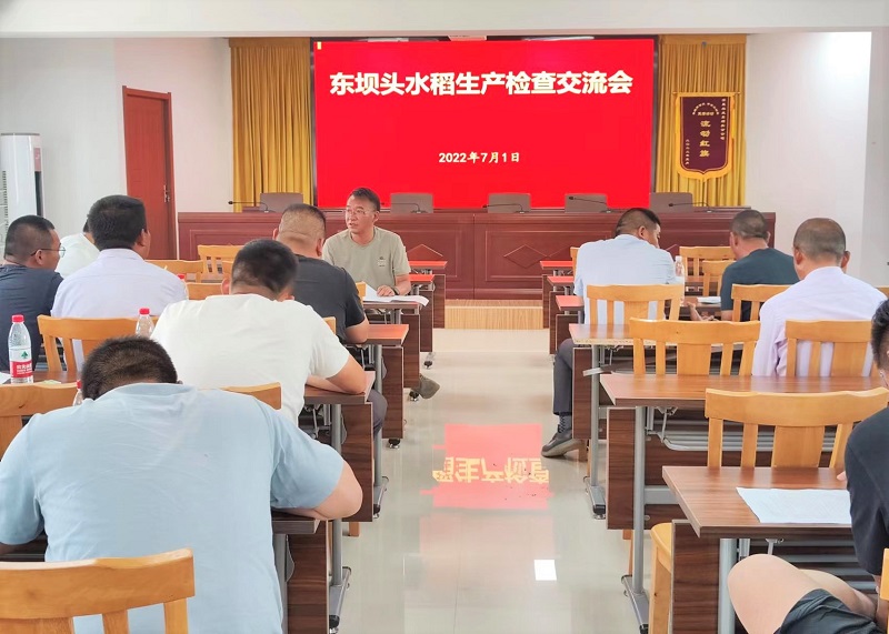 检查结束后,东坝头立即召开了水稻生产检查交流会,所有参加检查的人员就检查田块的品种、播期、施肥、化除等基本生产情况进行了评价交流,认真听取在场人员提出的相关建议。最后,浦东同志根据农发总部种植业管理中心《2022年水稻栽后管理生产检查情况通报》文件精神,结合当前检查的实际情况进行分析评价,并提出相关要求:一是抓好水层管理,促进浅水处分蘖;二是加快施肥节奏,减轻田间杂草防除压力;三是继续跟进查苗补缺工作,为东坝头水稻超高产打下坚实基础;四是坚持“药肥双减”,严格按照《东坝头农情》麦稻操作规程用药,确保稻米质量安全;五是农业中心要加强病虫草害预测预报,科学制定防治策略,提高综合防治效果。