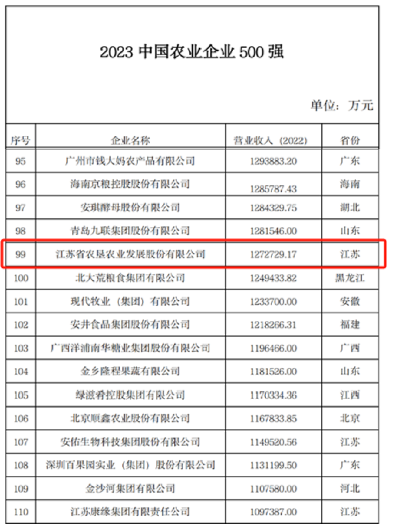 •   近日,农民日报社发布了2023中国农业企业500强名单,苏垦农发再次成功入选,位列第99位,较去年提升22位;此次活动还评选了2023中国农业企业行业20强名单,苏垦农发再次入选农业社会化服务行业20强,位列第5位,较去年上升1位。再度入选中国农业企业500强、中国农业企业行业20强,标志着苏垦农发行业地位得到进一步认可和巩固,竞争优势得到进一步凸显和提升。