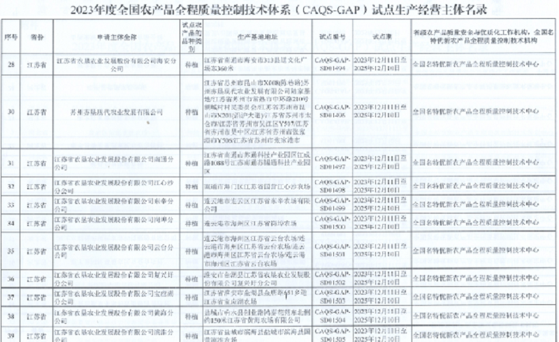 • 近日,农业农村部农产品质量安全中心公布2023年度全国农产品全程质量控制技术体系(CAQS-GAP)试点生产经营主体名录,苏垦农发旗下19家分公司和子公司苏州苏垦现代农业发展有限公司均榜上有名。