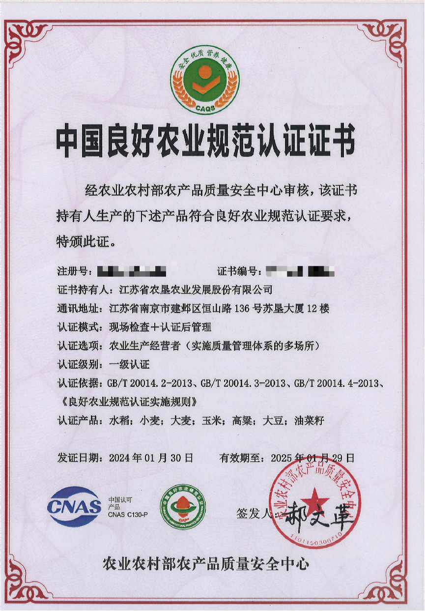 苏垦农发获全国单体最大规模良好农业规范(GAP)一级认证
