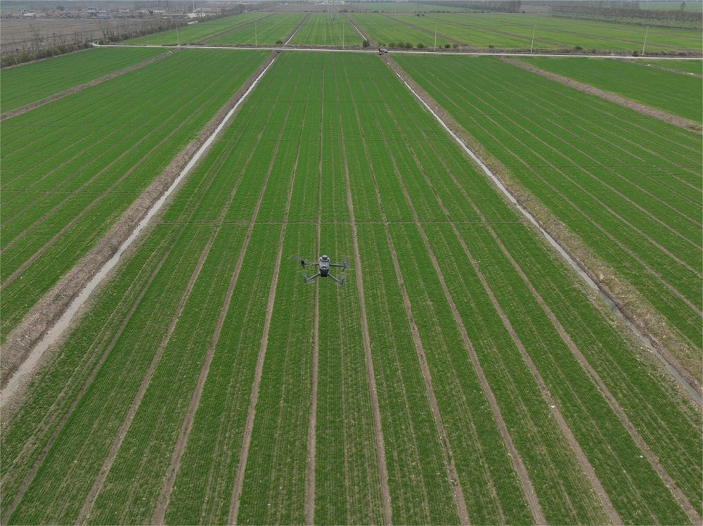 (2024年11月9日,苏垦农发东辛分公司无人机查看苗情)