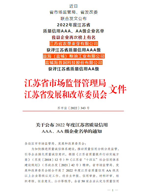 2022年11月30日,江苏省市场监督管理局与江苏省发展和改革委员会发布2022年度江苏省质量信用AAA、AA级企业名单,麦芽公司获评江苏省质量信用AAA级。江苏省工业企业质量信用评价每年评定一次,旨在引导推动企业强化质量诚信意识,建立健全质量诚信制度,强化企业落实质量主体责任。质量信用等级共分为A、B、C、D四个级别,其中信用较好的A级细分为A、AA、AAA三个级别,AAA级是最高等级。 近年来,苏垦麦芽根据相关国家标准、行业标准以及客户标准对麦芽生产、产品质量以及仓储等各环节建立相应技术标准和分析方法,确保质量管理合理化、标准化、规范化、科学化,共制定了108条分析方法、53条管理规定、涵盖原材料、半成品、成品和存储环境等9大方面的数百项产品技术标准。坚持开展诚信守法合规体系建设,建立覆盖生产、销售及服务全过程的质量诚信管理制度,强化职工诚信守法意识,营造守法文化,完善自我监督闭环。 此次获得江苏省质量信用AAA级认定,对于进一步提升苏垦麦芽品牌价值、完善质量管理制度、提高全员质量诚信意识、增强核心竞争力具有重要意义。苏垦麦芽将持续推进质量诚信体系建设,助力江苏农