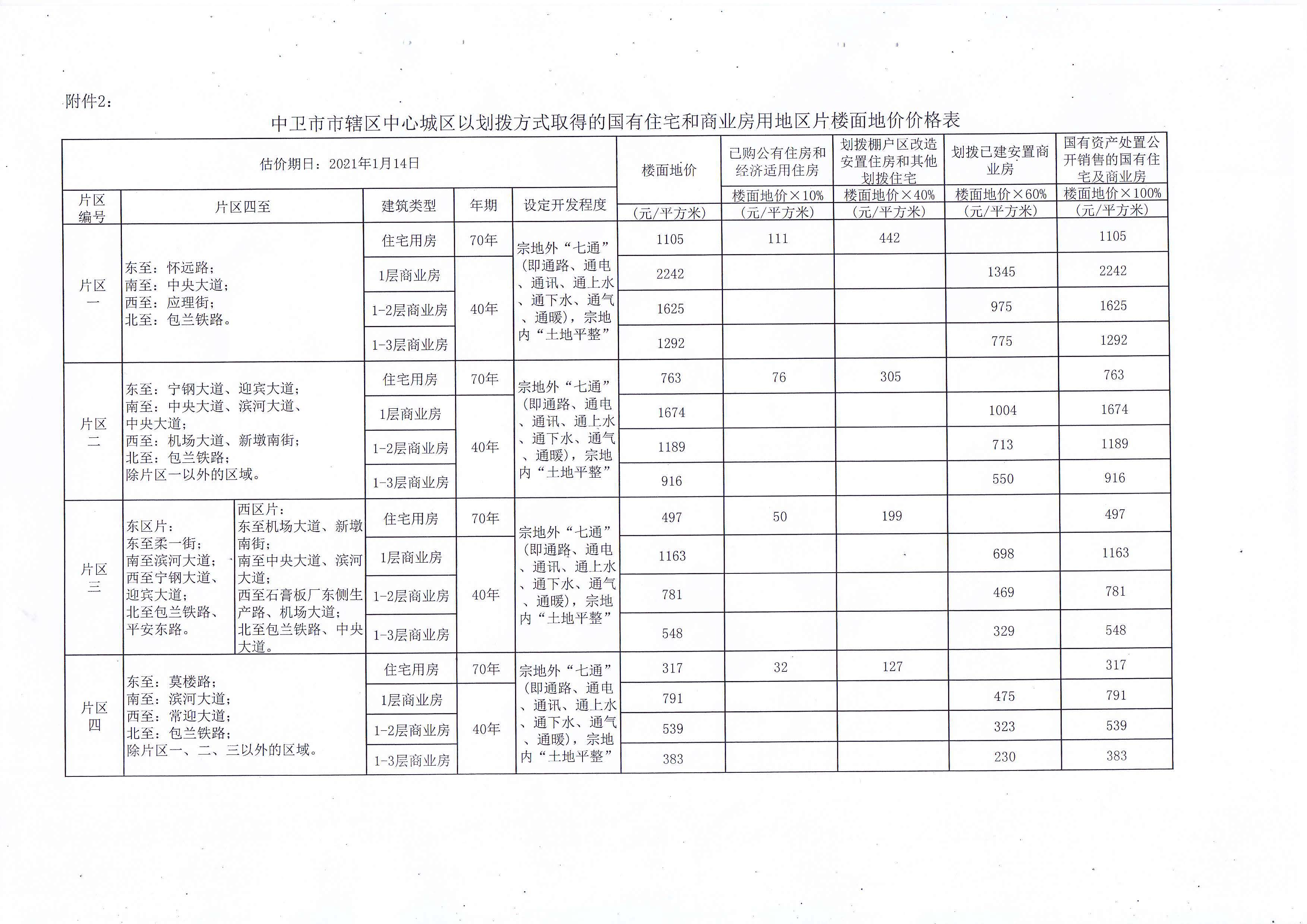 2.中卫市市辖区中心城区以划拨方式取得的国有住宅和商业房用地区片楼面地价价格表