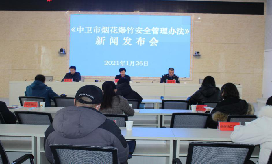1月26日下午,《中卫市烟花爆竹安全管理办法》(以下简称《办法》)新闻发布会在市公安局六楼视频会议室举行。市委宣传部副部长胡立华,市司法局党组成员、三级调研员张金兰,以及市公安局治安管理局负责人雍建军发布《办法》有关情况并答记者问。